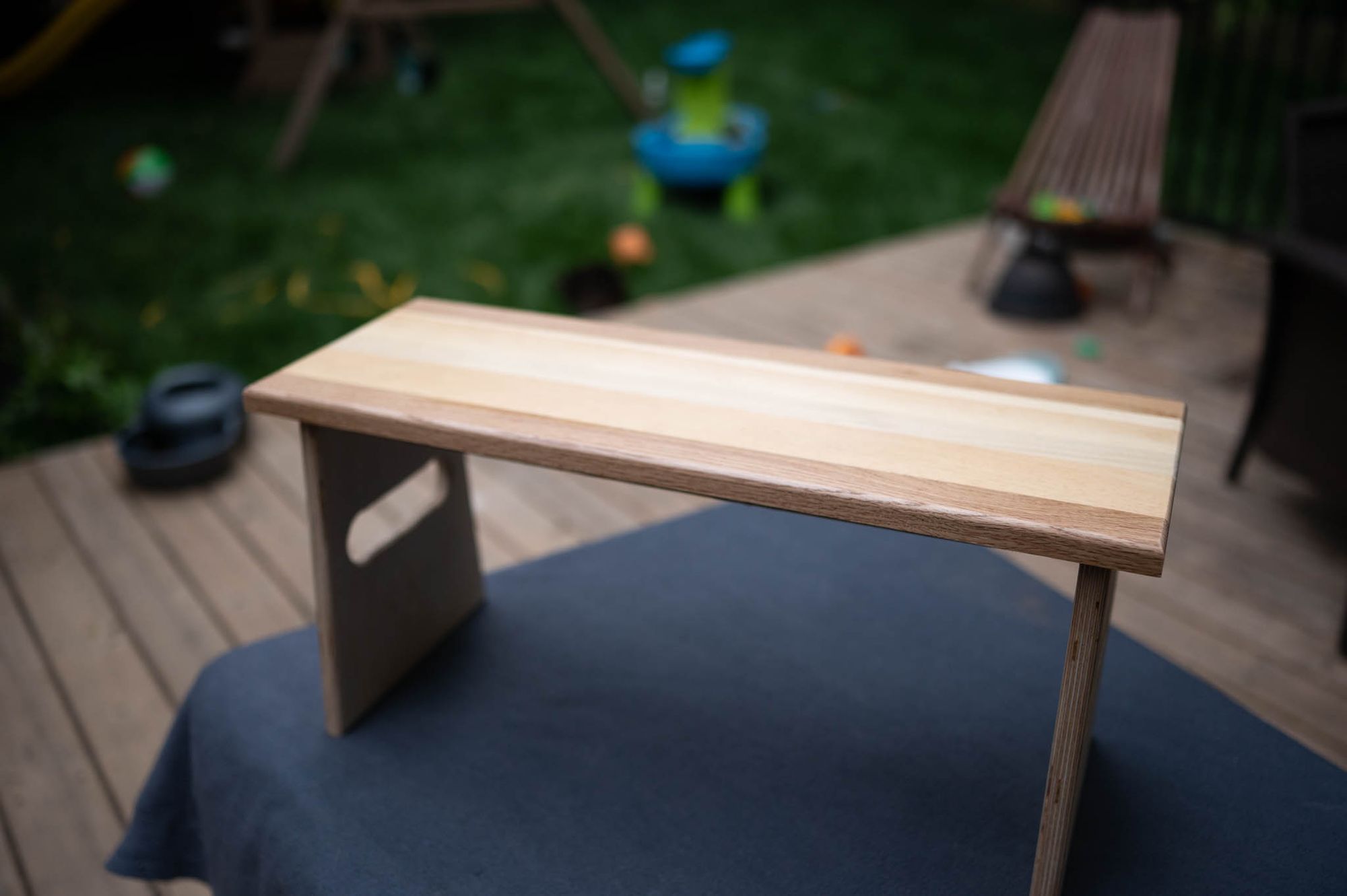 I didn't bother with a design in SketchUp, instead I edge joined a few scrap boards together, fit an apron together with some other scrap, then used a plunge router to carve the holes in the legs, and a round over bit on my trim router to soften the edges. Finish was some spray laquer, and some rubber non-slip pads under the legs to help it stay in place.