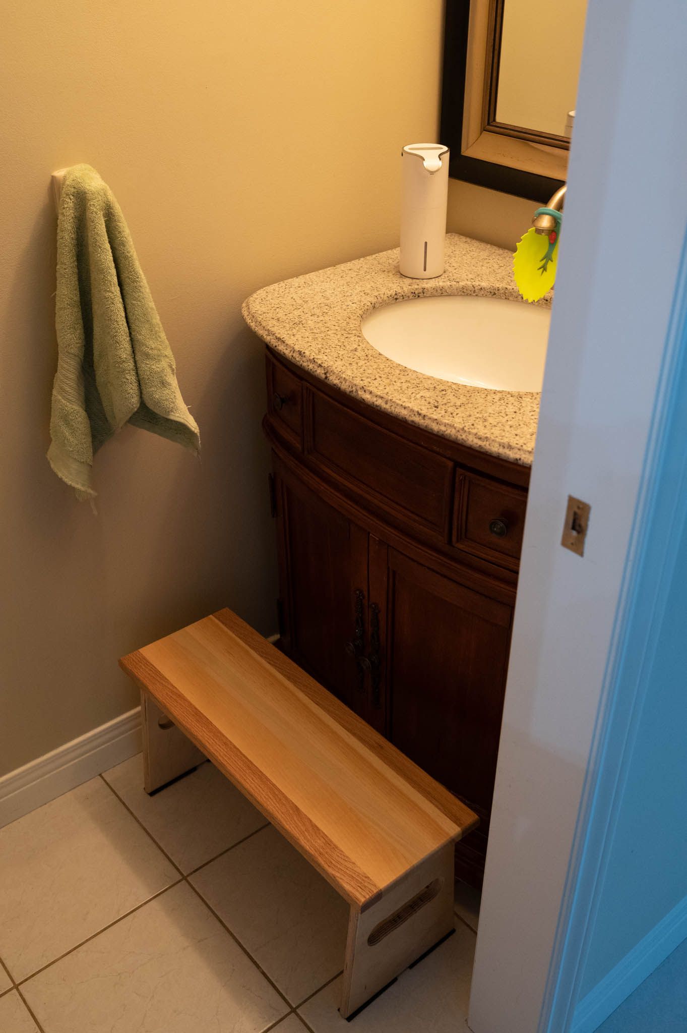 The stool works great, and Cayce can reach the taps now! There's something incredibly heartwarming about giving your kids any extra bit of independence, and Cayce is just so happy she can reach the taps now.