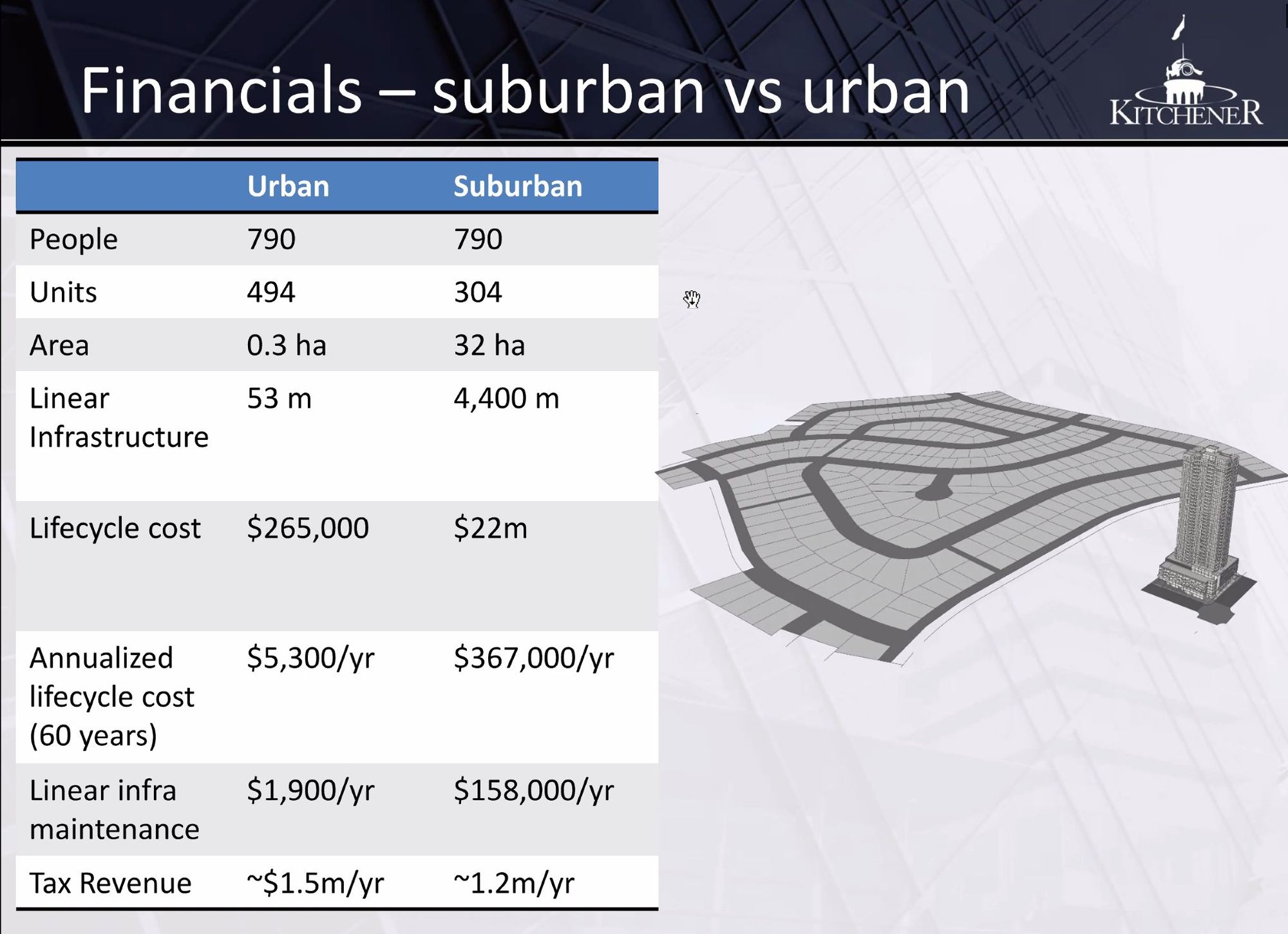This slide from the City of Kitchener shows relative costs for the city to service 790 people. There's a stark difference in cost, not reflected in the revenue received.